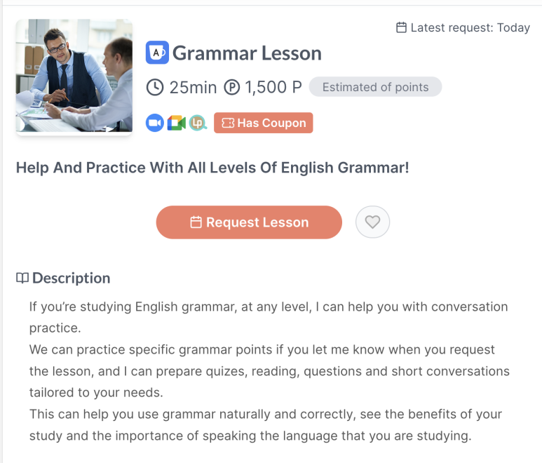 영국 출신의 영어 원어민 Jez Quiney 강사의 영어 문법 레슨은 학생이 배우고 싶은 문법 주제를 정하여 반복적인 연습을 통해 학습하는 시간입니다. 강사가 퀴즈, 텍스트 읽기, 문제풀이 또는 회화 등 다양한 콘텐츠를 통해 수강생이 좀 더 흥미롭게 문법을 공부할 수 있도록 합니다. 또한 원어민 강사와 소통을 하며 영어 회화 실력도 업그레이드할 수 있어요.